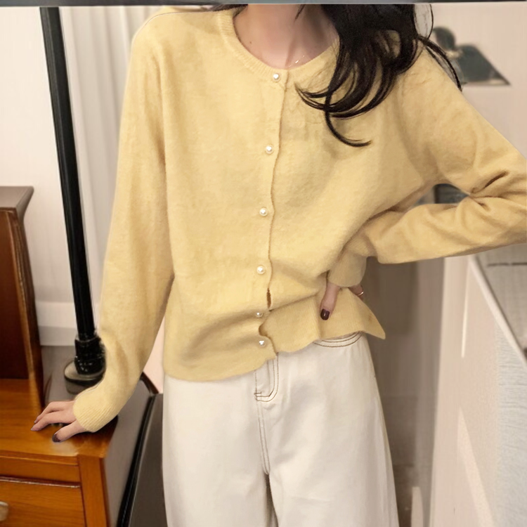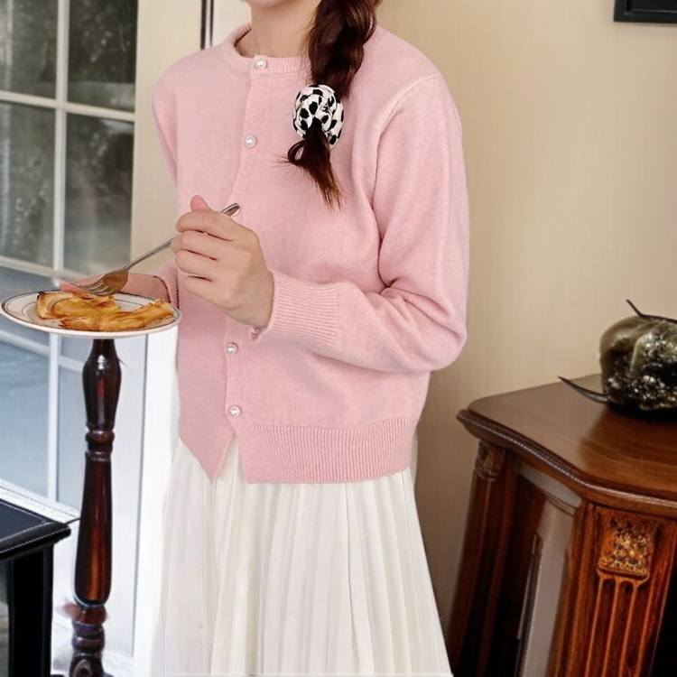 여성 니트 가디건 긴팔 솔리드 상의 진주 버클 여성 봄가을 라운드 니트 가디건 부드러운 니트 코트